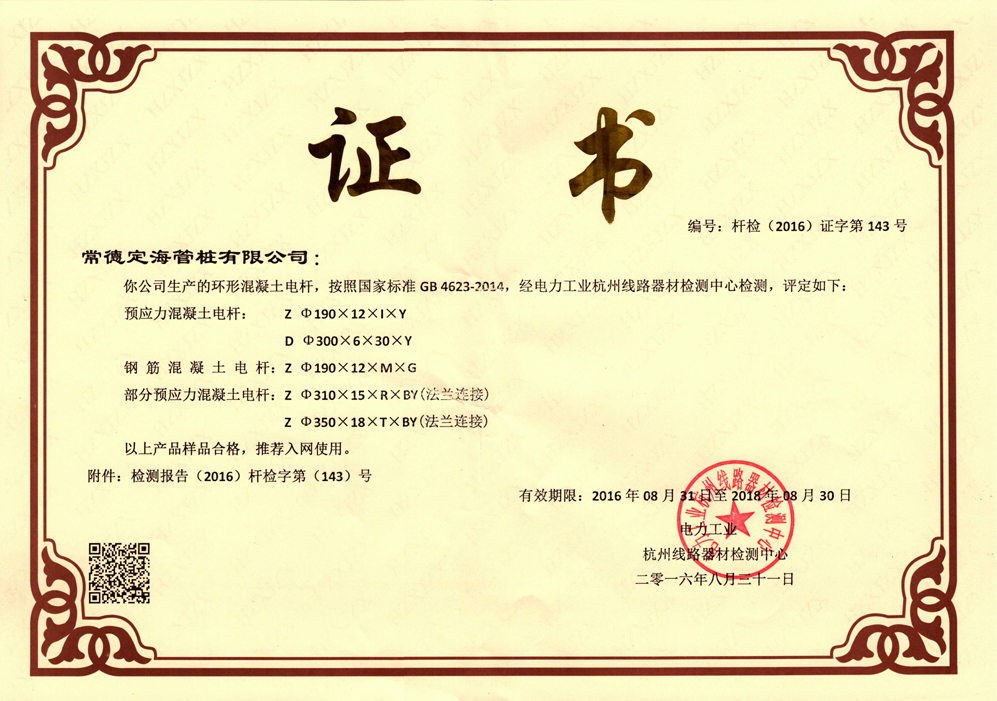 由本公司根據(jù)國標GB4623-2014《環(huán)形混凝土電桿》研發(fā)生產(chǎn)并申請專利的系列預(yù)應(yīng)力混凝土等徑高壓電桿、系列部分預(yù)應(yīng)力混凝土大彎矩電桿、系列鋼筋混凝土電桿。經(jīng)國家電力線路器材檢測機構(gòu)具備簽發(fā)入網(wǎng)許可證書的單位,電力工業(yè)杭州線路器材檢測中心實地抽樣檢測,各項檢測指標均優(yōu)于國家標準,簽發(fā)了桿檢(2016)證字第143號推薦入網(wǎng)使用證書。為公司的產(chǎn)業(yè)鏈延伸以及電桿項目投標提供了有力的技術(shù)支撐。