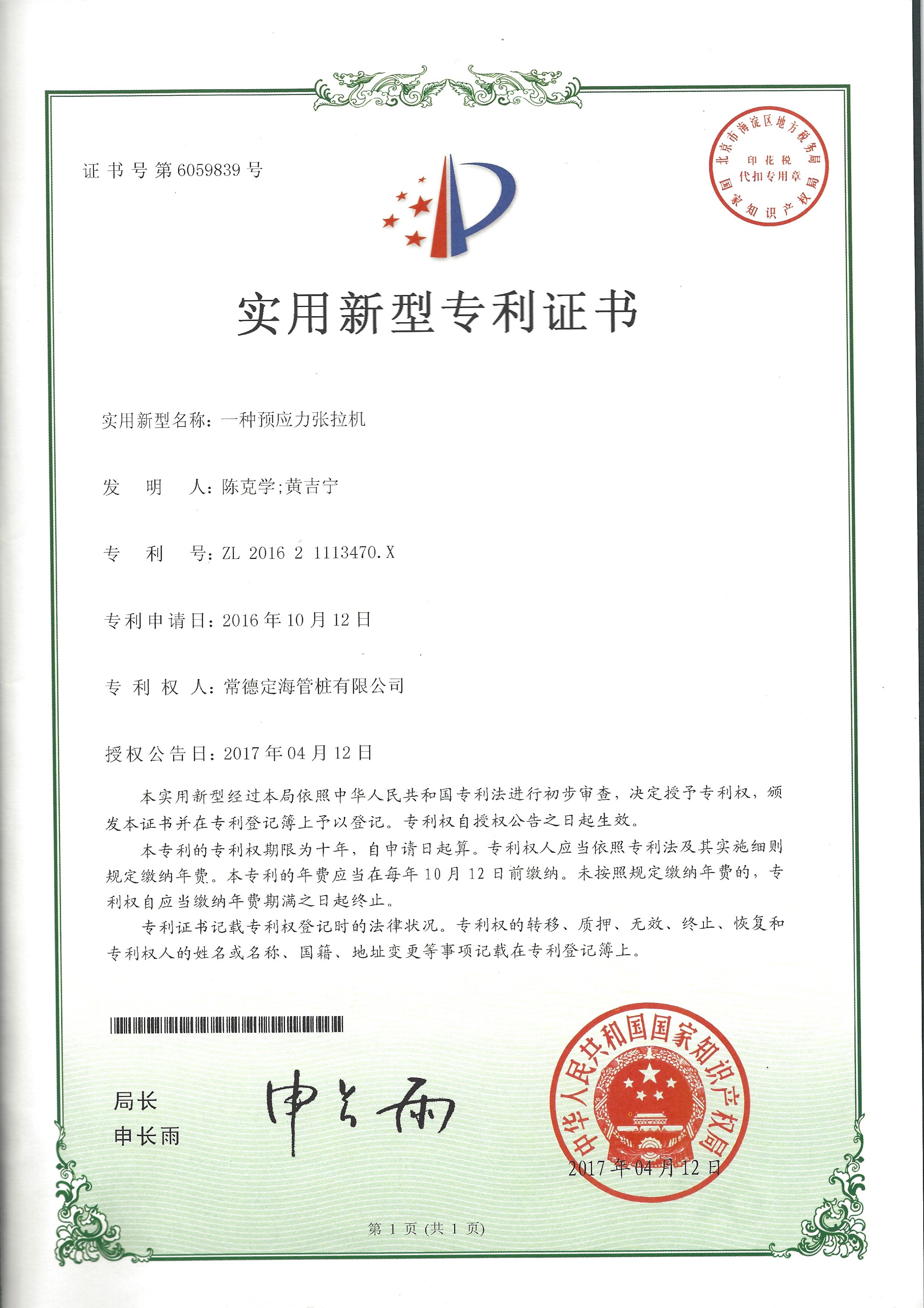 2017年4月12日,我公司申報的“一種預應力張拉機”,成功獲得國家知識產(chǎn)權局頒發(fā)的實用新型專利證書,專利期限為十年。此專利的取得,增加了公司產(chǎn)品參與市場競爭的軟實力。